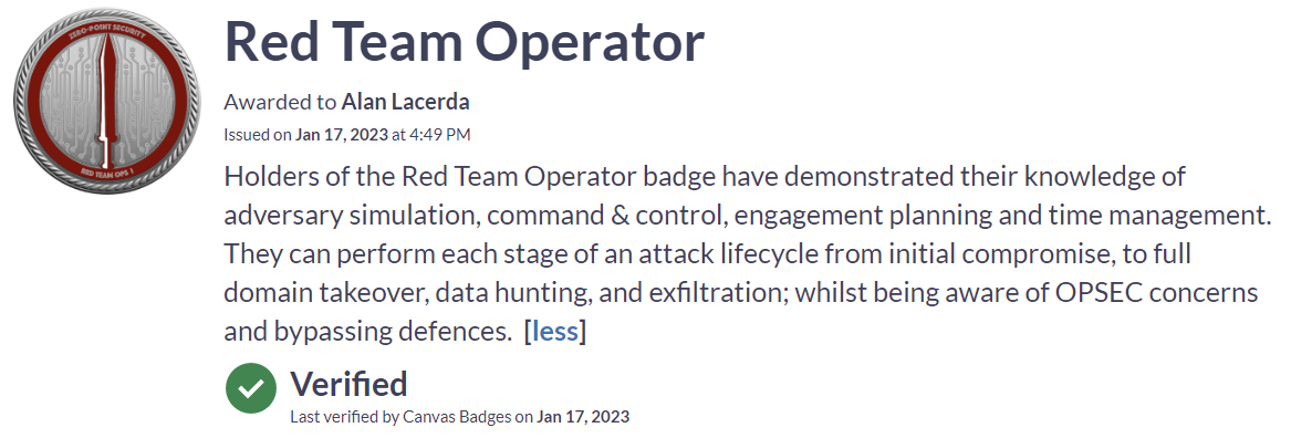Admito que essa não foi uma jornada simples de concluir mas valeu a pena. Venho de uma série de treinamentos envolvendo a área de Segurança Ofensiva e graças às atividades que desenvolvo na iSecurity e IntruderLabs tenho tido a oportunidade de colocar muito do que aprendo em prática. Isso com certeza ajudou bastante a digerir o conteúdo do treinamento enquanto eu entendia diversos pontos que eu precisava/preciso me aprofundar mais.